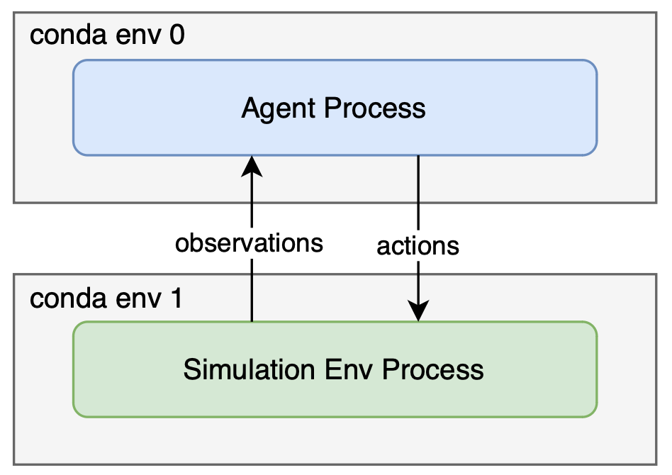 The agent runs as a separate process with its own python virtual environment, and currently it communicates with the simulation env process through HTTP localhost.